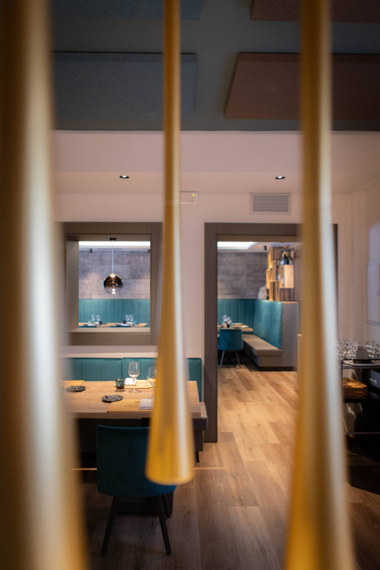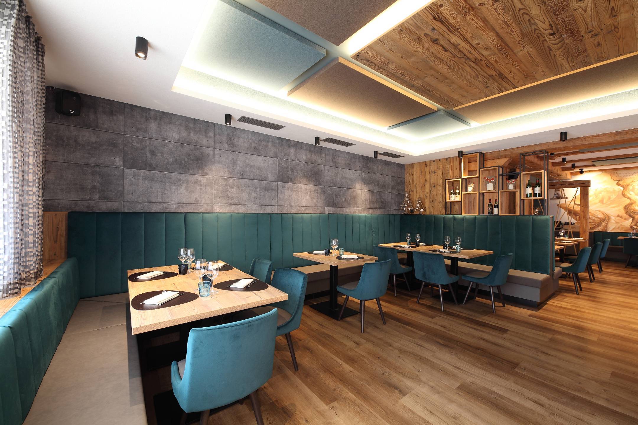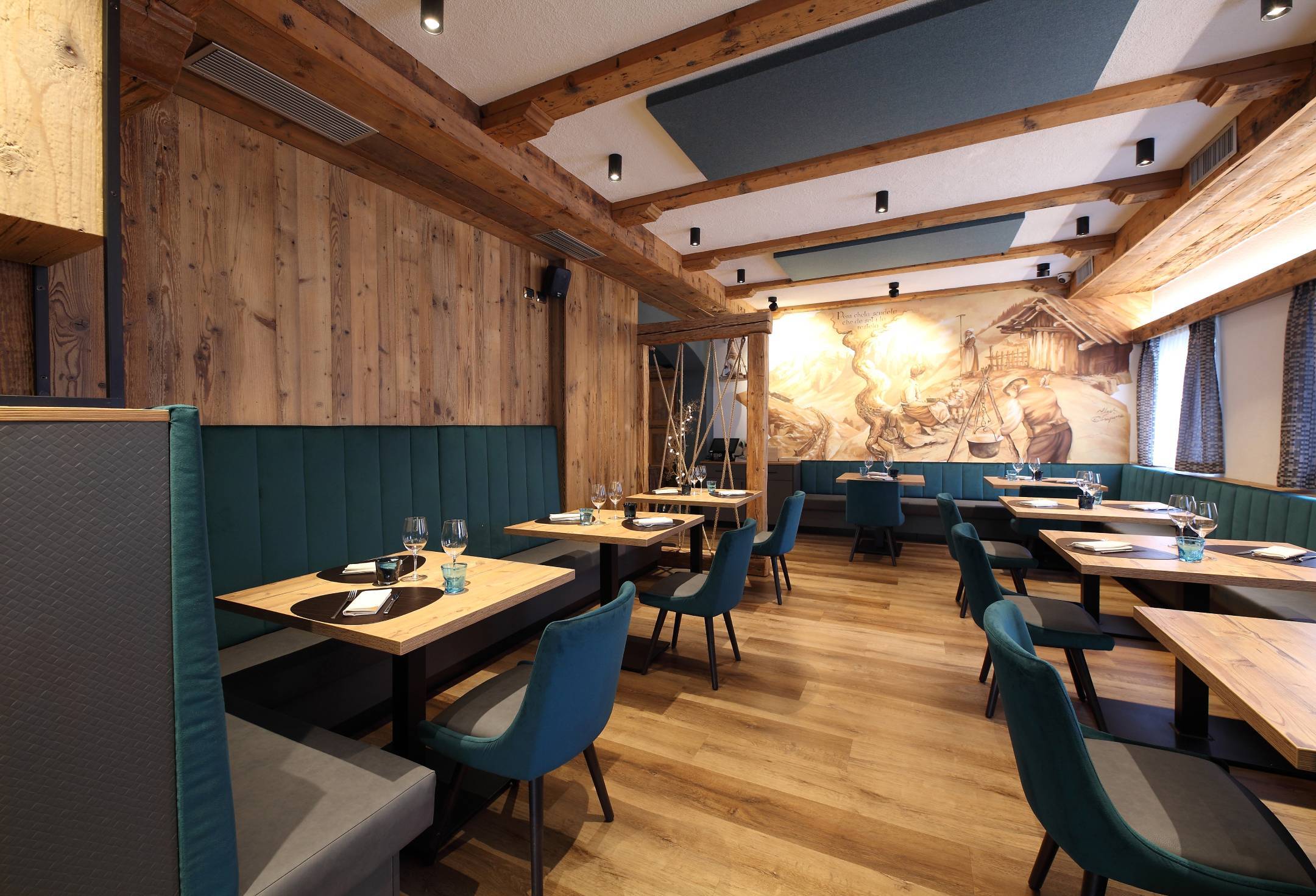Il nuovo linguaggio progettuale si fonda su un equilibrio tra tradizione e raffinatezza. I tessuti e i colori giocano un ruolo chiave: il velluto deciso delle sedute dialoga con il legno di abete invecchiato degli arredi, creando un’atmosfera elegante ma autentica. Le scelte materiche e cromatiche riflettono la personalità dei proprietari, la loro grinta e la passione che da sempre caratterizzano la storia del locale.