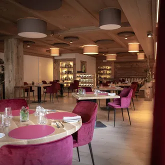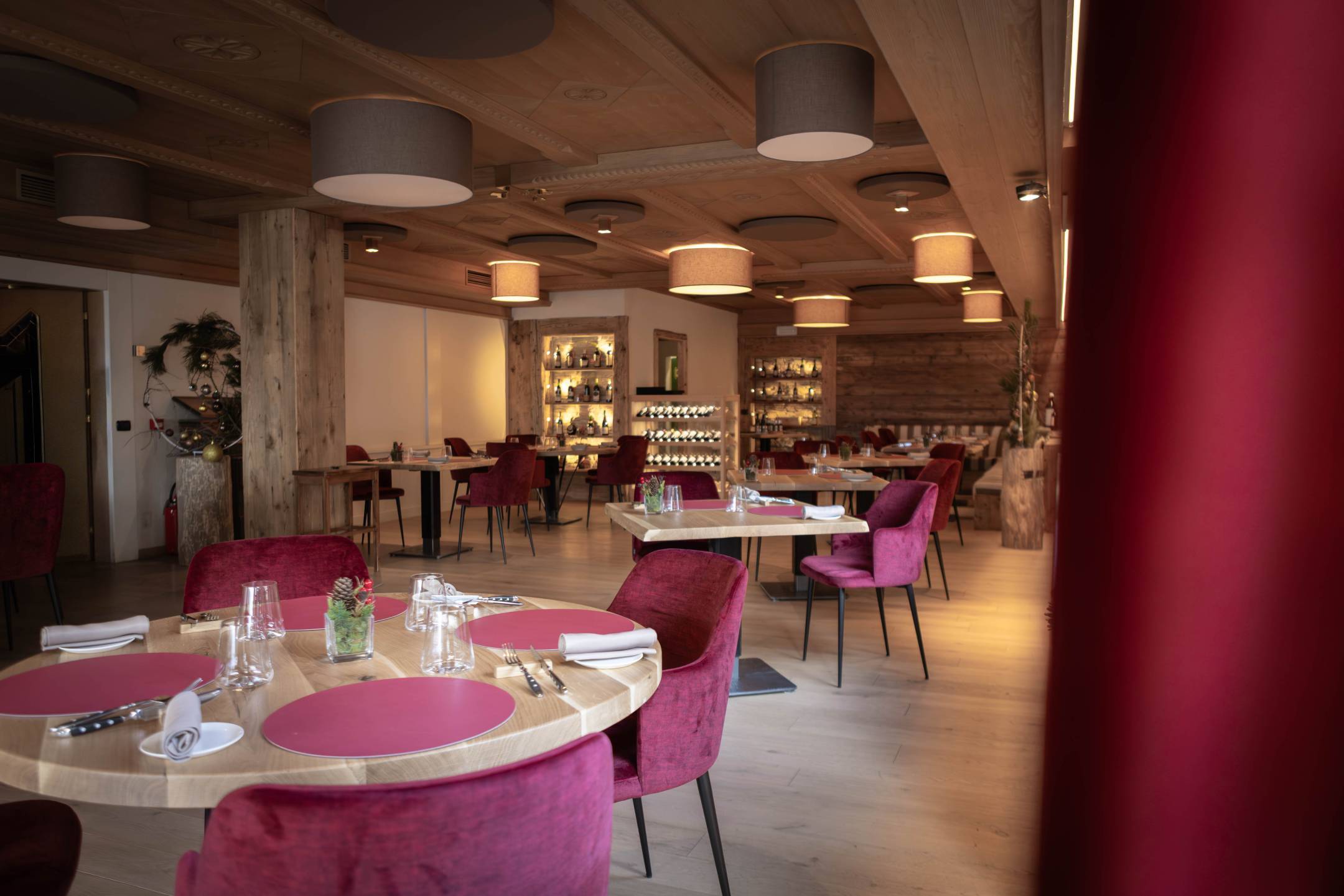 Situato a Cavalese, nel cuore della Val di Fiemme, La Roccia Wellness Hotel si distingue per ambienti caldi e raffinati, in cui il legno, la luce naturale e il dialogo con il paesaggio alpino definiscono l’identità degli spazi. La sala ristorante, affacciata sulla valle attraverso ampie vetrate panoramiche, è caratterizzata da un soffitto interamente rivestito in legno intagliato, pareti con finitura rustica e un pavimento in doghe di legno naturale.
