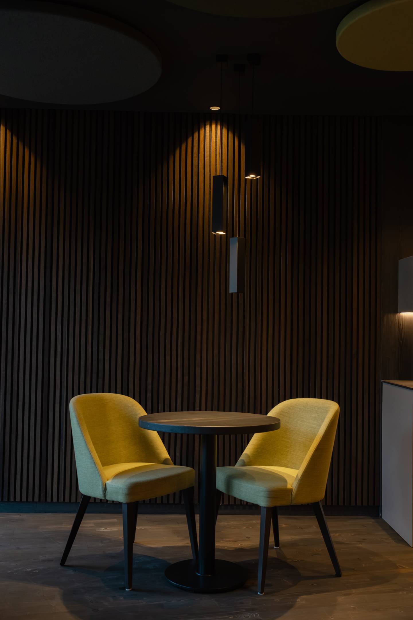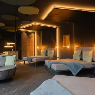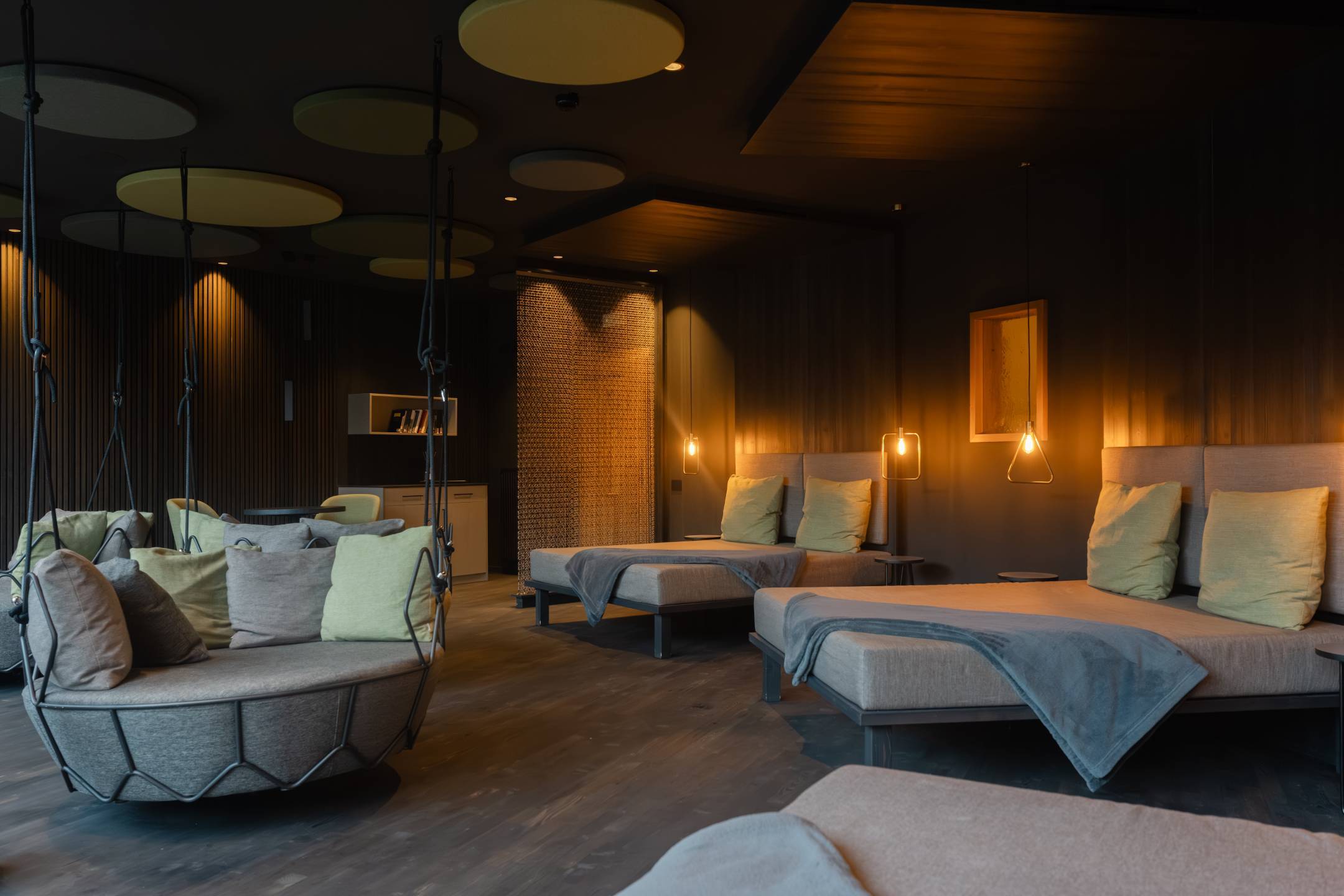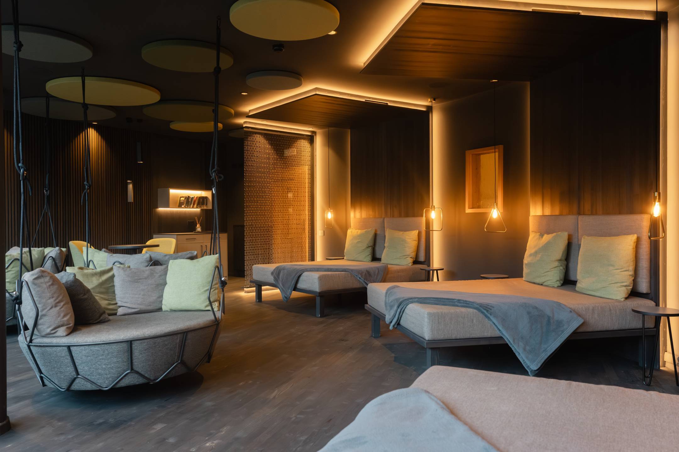 L’illuminazione, studiata in modo puntuale e controllato, si concentra sui tavolini e sulle zone funzionali, evitando abbagliamenti e disturbi visivi. Il risultato è un ambiente silenzioso, raccolto e avvolgente, in cui luce, materiali e acustica lavorano insieme per favorire il rilassamento e invitare naturalmente a socchiudere gli occhi.