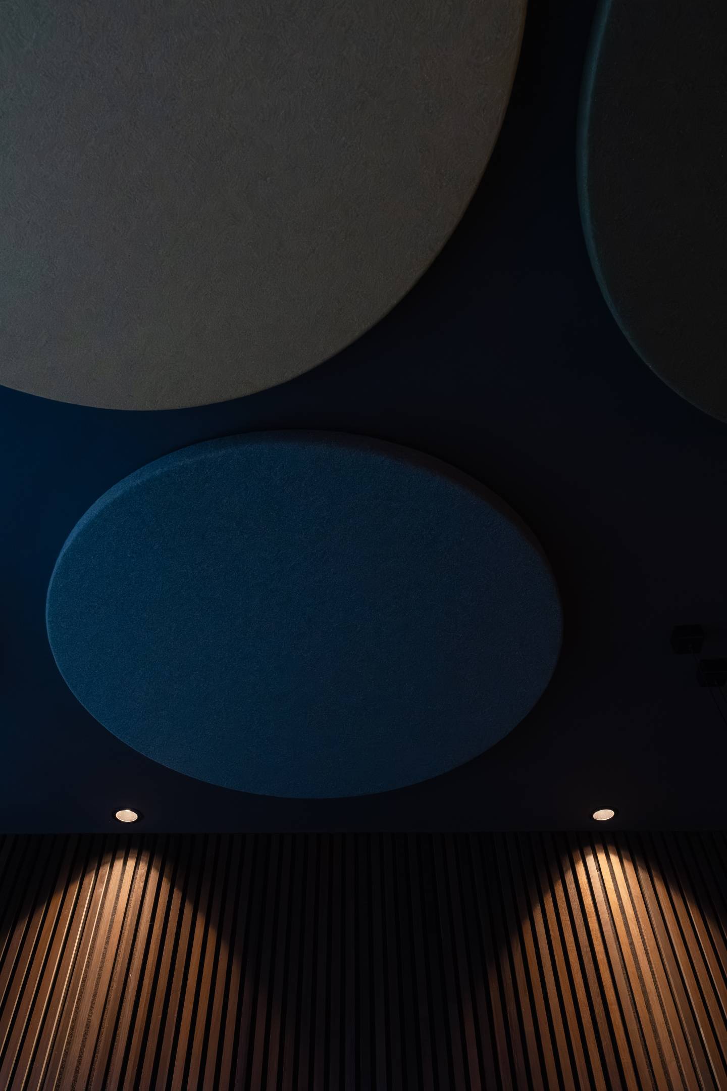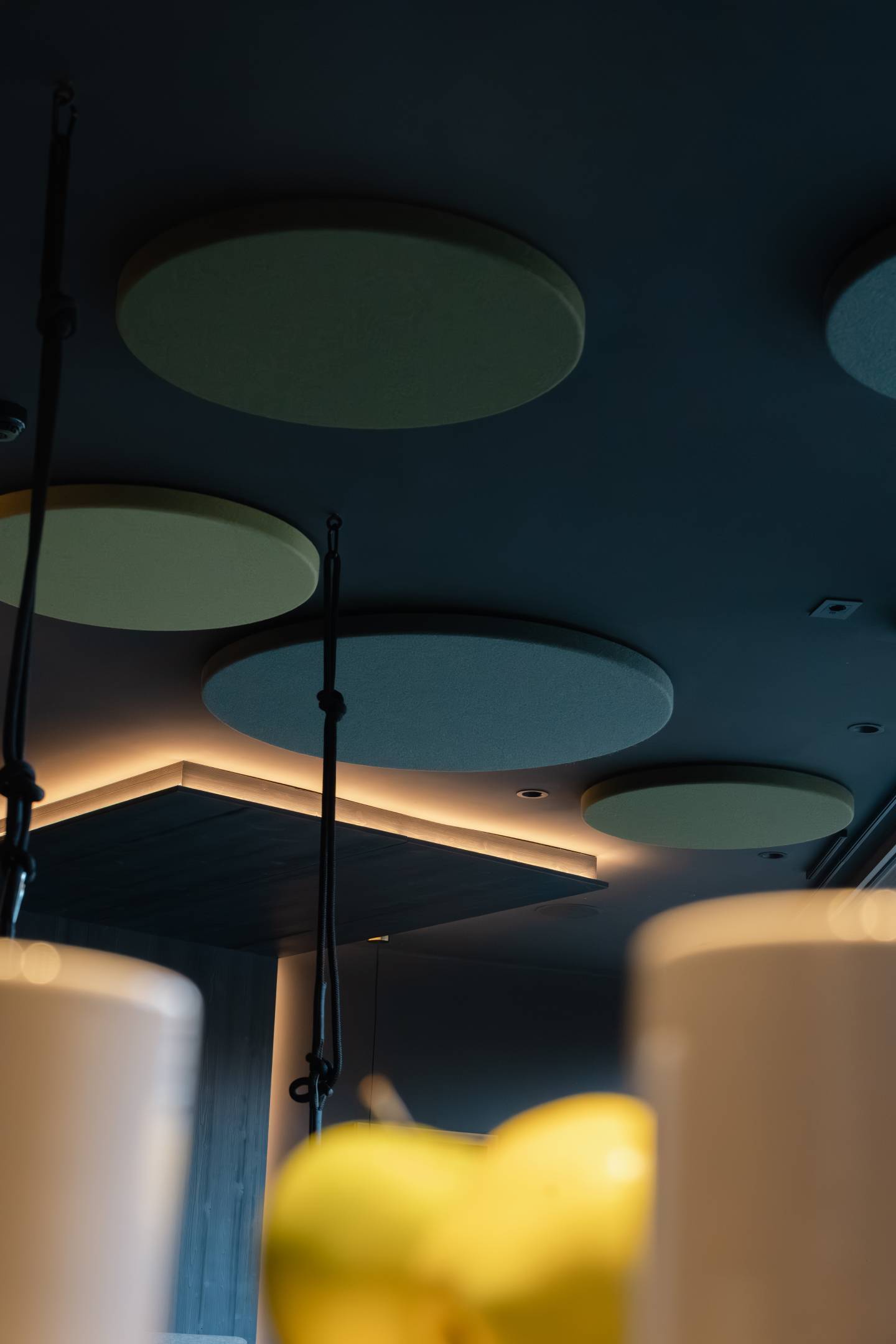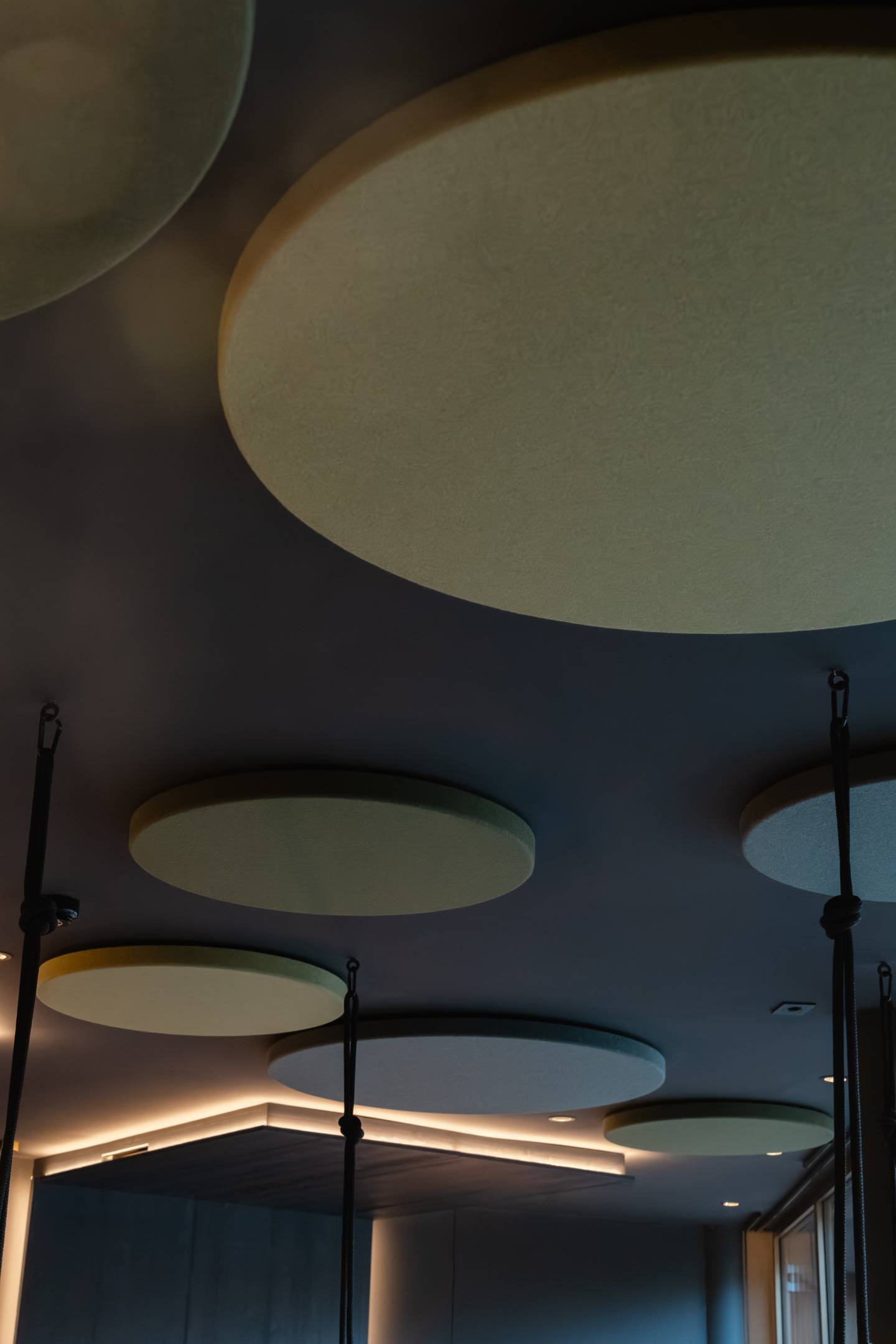 L’intervento di comfort acustico è stato integrato in modo discreto e coerente con il progetto d’interni. A soffitto sono stati inseriti pannelli fonoassorbenti di forma circolare, ripresi cromaticamente dai cuscini dei lettini, così da fondersi visivamente con l’ambiente e contribuire al benessere sonoro senza interrompere la percezione di continuità.