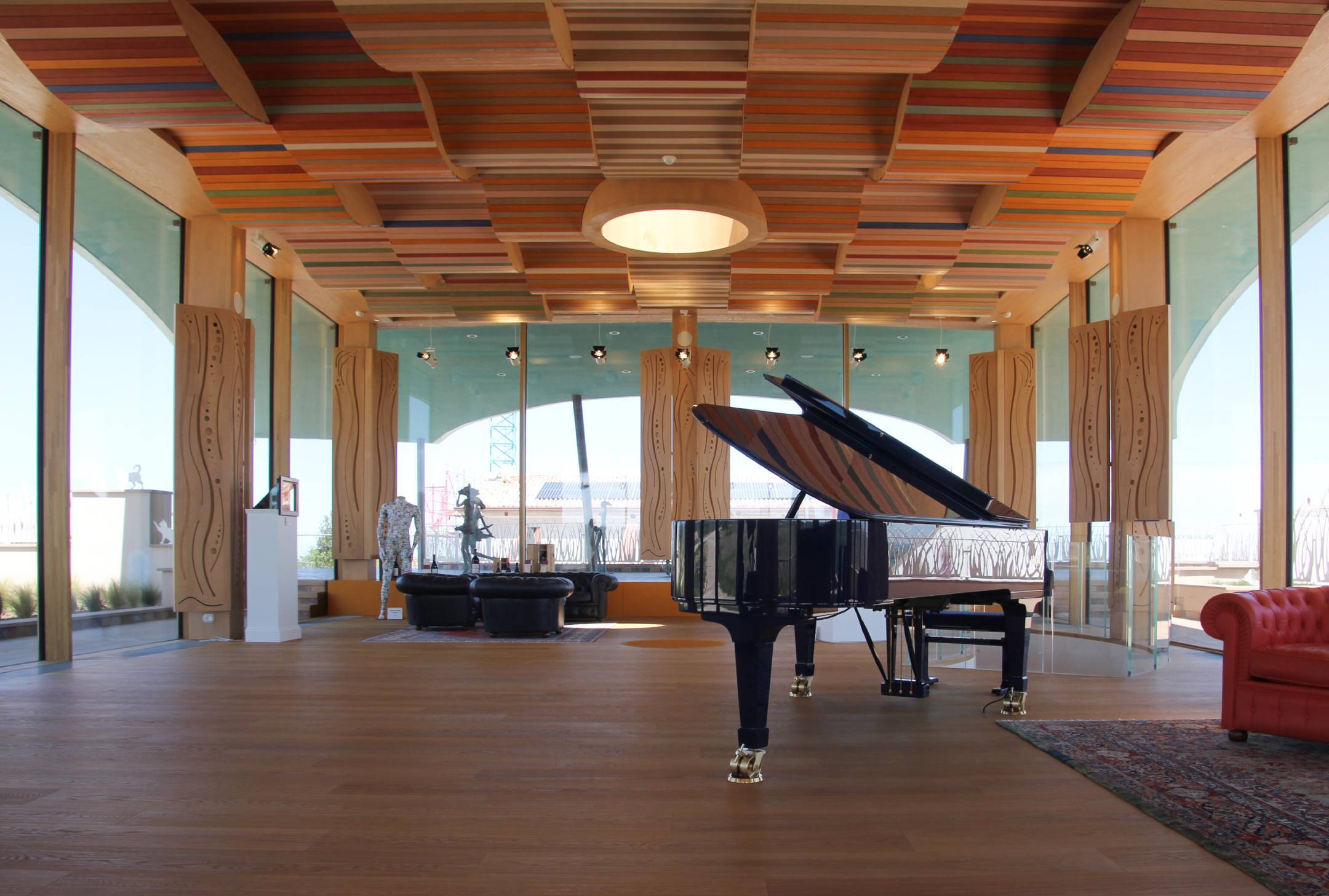 Realizzazione di un soffitto acustico in legno progettato per ridurre il riverbero generato dalle grandi superfici vetrate, migliorando l’ascolto e l’armonia del suono del pianoforte.